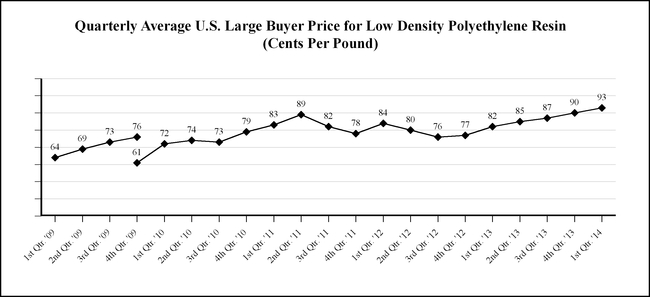 See the executive summary beginning on page 19 for discussion regarding the impact of the lag in the pass-through of resin price changes. The volatility of average quarterly prices of low density polyethylene resin in the U.S. (a primary raw material for Film Products) is shown in the chart below.