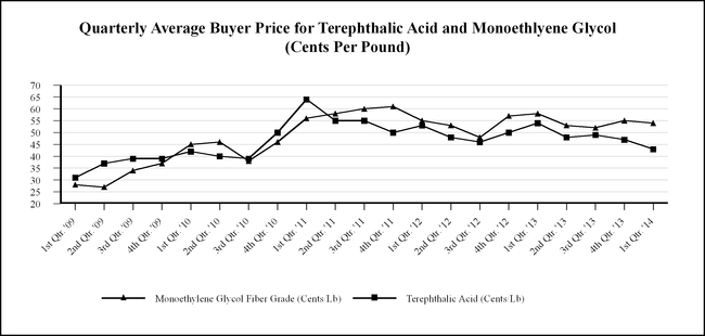 The volatility of average quarterly prices of PTA and MEG (raw materials for Film Products) is shown in the chart below.