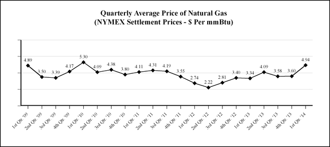 The volatility of quarterly average natural gas prices is shown in the chart below.
