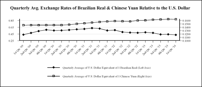Trends for the Brazilian Real and Chinese Yuan are shown in the chart below.