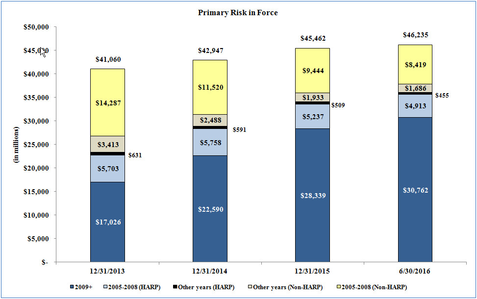 In addition to the effect of reinsurance on our premium yield, we expect a modest decline in premium yield resulting from the premium rates themselves: the books we wrote before 2009, which have a higher average premium rate than subsequent books, are expected to continue to decline as a percentage of the insurance in force; and the average premium rate on these books is also expected to decline as the premium rates reset to lower levels at the time the loans reach the ten-year anniversary of their initial coverage date. However, for loans that have utilized HARP, the initial ten-year period was reset to begin as of the date of the HARP transaction. As of June 30, 2016, approximately 4%, 8% and 3% of our primary risk in force was written in 2006, 2007,
