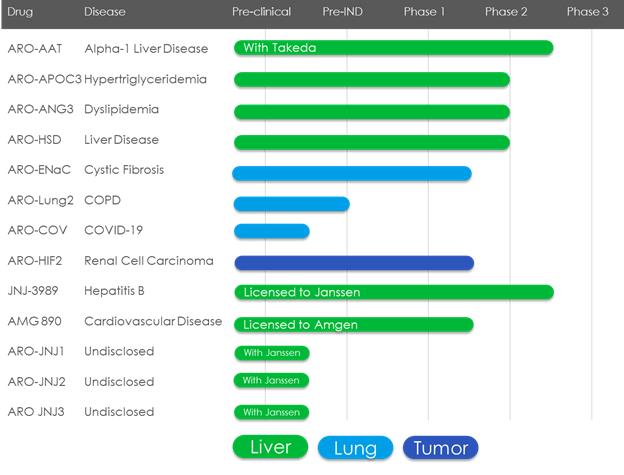 ARO-AAT is the Company’s second generation subcutaneously administered RNAi therapeutic being developed as a treatment for liver disease associated with alpha-1 antitrypsin deficiency (AATD), which is a rare genetic disorder that severely damages the liver and lungs of affected individuals. ARO-AAT is designed to reduce production of the mutant Z-AAT protein by silencing the AAT gene in order to prevent accumulation of Z-AAT in the liver, allow clearance of the accumulated Z-AAT protein, prevent repeated cycles of cellular damage, and possibly prevent or even reverse the progression of liver fibrosis. In October 2020, Arrowhead signed an agreement with the Takeda Pharmaceuticals U.S.A., Inc. to co-develop and co-commercialize ARO-AAT, pending completion of review under antitrust laws, including the Hart-Scott-Rodino Antitrust Improvements Act of 1976 in the United States.