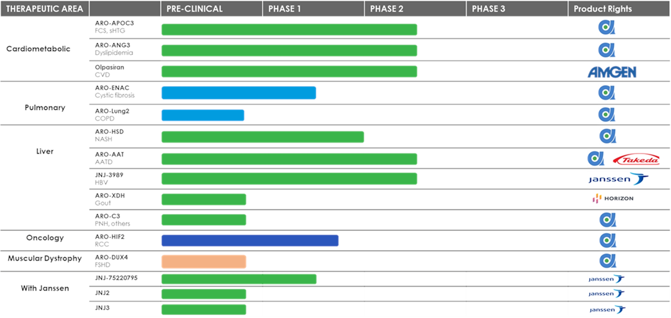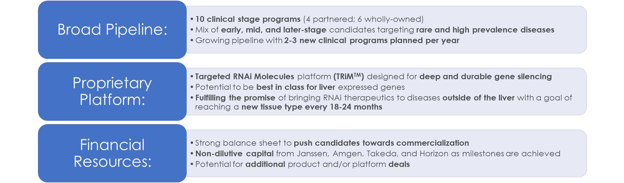 Arrowhead is focused on developing innovative drugs for diseases with a genetic basis, typically characterized by the overproduction of one or more proteins that are involved with disease. The depth and versatility of our RNAi technologies enables us to potentially address conditions in virtually any therapeutic area and pursue disease targets that are not otherwise addressable by small molecules and biologics. Arrowhead is focused on bringing the promise of RNAi to address diseases outside of the liver and our pipeline now includes disease targets in the liver, lung, muscle, and solid tumors.
