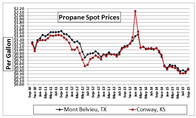The following graph shows the average prices of propane on the propane spot market during the last five fiscal years at Mont Belvieu, Texas and Conway, Kansas, both major storage areas.