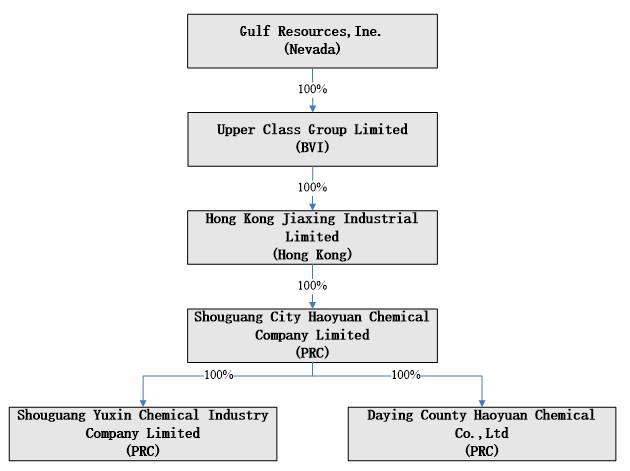 As a result of the transactions described above, our corporate structure is linear. That is Gulf Resources owns 100% of the outstanding shares of Upper Class Group Limited, which owns 100% of the outstanding shares of Hong Kong Jiaxing, which owns 100% of the outstanding shares of SCHC, which owns 100% of the outstanding shares of SYCI. Further, as a result of our acquisitions of SCHC and SYCI, our historical consolidated financial statements, as contained in our Consolidated Financial Statements and Management's Discussion and Analysis, appearing elsewhere in the report, reflect the accounts of SCHC and SYCI.