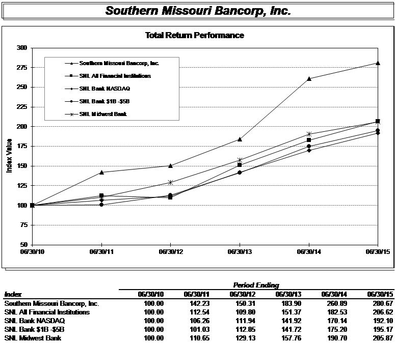 The following financial statements from the Southern Missouri Bancorp, Inc. Annual Report on Form 10-K for the fiscal year ended June 30, 2015, formatted in Extensive Business Reporting Language (XBRL): (i) consolidated balance sheets, (ii) consolidated statements of income, (iii) consolidated statements of comprehensive income, (iv) consolidated statements of stockholders' equity, (v) consolidated statements of cash flows and (vi) the notes to consolidated financial statements