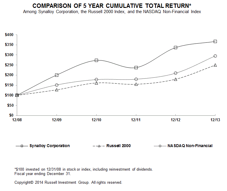 The purchase price for the Palmer acquisition was $25,575,000 in cash, and subject to working capital and fixed asset adjustments at closing. The adjustments at closing increased the purchase price to $26,951,209. In addition, the amount of maintenance expenditures over the 18-month period following closing and the final cost of a production expansion capital project currently underway could also result in purchase price adjustments. Currently, the Company does not expect to realize any material purchase price adjustments from these two items. Palmer shareholders also have the ability to receive contingent consideration ("earn-out") payments ranging from $2,500,000 to $10,500,000 if the business unit achieves targeted levels of earnings before interest, taxes, depreciation and amortization ("EBITDA") over a three year period following closing; and the Company will have the ability to claw-back portions of the purchase price over a two year period following closing if EBITDA falls below baseline levels. The Palmer former shareholders received the first year earn-out payment during 2013 of $2,500,000. This amount was partially offset by claims made against the sellers, as designated in the SPA, amounting to $885,000. The net amount paid to the sellers after the first year of Synalloy ownership was $1,615,000.
